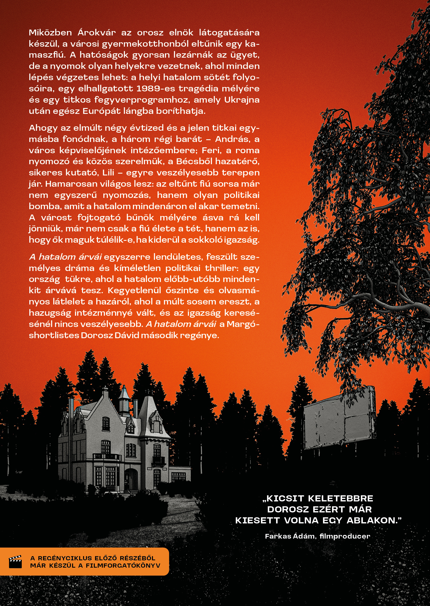 A Hatalom árvái egyszerre lendületes, feszült személyes dráma és kíméletlen politikai thriller: egy ország tükre, ahol a hatalom előbb-utóbb mindenkit árvává tesz. Kegyetlenül őszinte és olvasmányos látlelet a hazáról, ahol a múlt sosem ereszt, a hazugság intézménnyé vált, és az igazság keresésénél nincs veszélyesebb. A Hatalom árvái a Bécsben élő, Margó-shortlistes Dorosz Dávid második regénye.